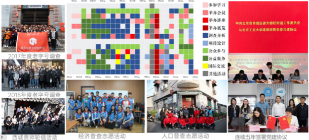 发挥党建的核心引领,打造师生党支部共建“四制工作法”,推行员工支部+教师支部+乡镇街道党组织共学共建机制,聚焦首都规划建设中人民群众最急迫、最现实、最直接问题,深入一线实践。自2018年开始,建规公司党委与北京市西城区大栅栏街道工委连年签署共建协议,规划系、建筑学支部与大栅栏西街、铁树斜街等社区结对子。员工们深度参与了大栅栏经济普查、人口普查、老字号调查、老旧小区更新、儿童友好城市、国际设计周等社会实践活动。