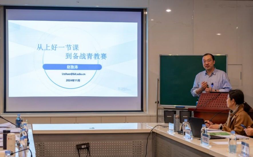 赛后,8位专家评委分别从教学目的、教学内容、教学形式、教学手段以及思政引入等多方面对青年教师的讲课表现了进行了全方位的深入点评。首先,全国青教赛一等奖获得者、国家级青年人才、北京市青年教学名师、北京理工大学教授赵鲁涛,以“从上好一节课,到备战青教赛”为题进行教学基本功专题讲座,赵教授从青教赛的评分细则、课堂内容、教学设计、师生互动、信息化等角度给予了青年教师们宝贵细致的建议。